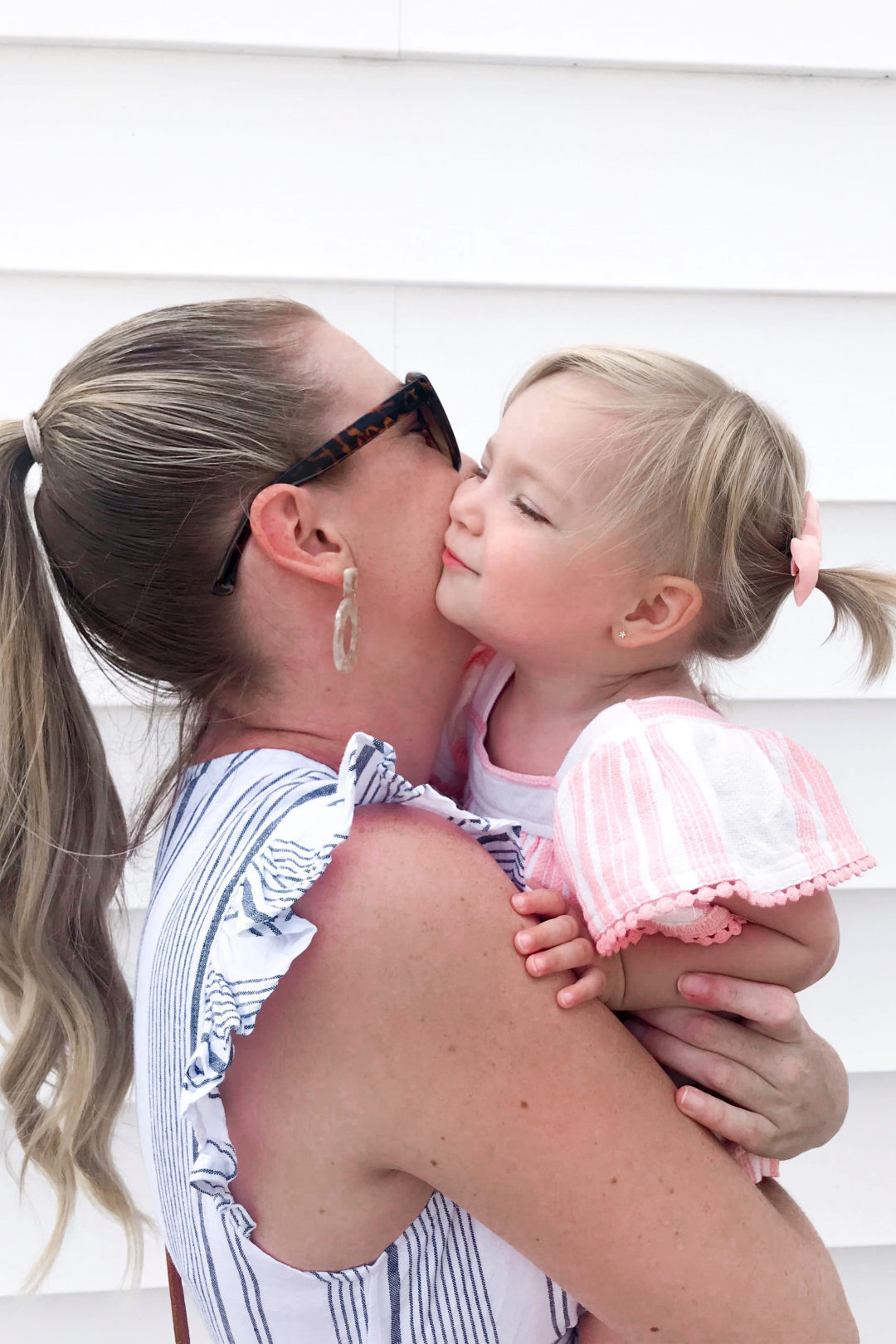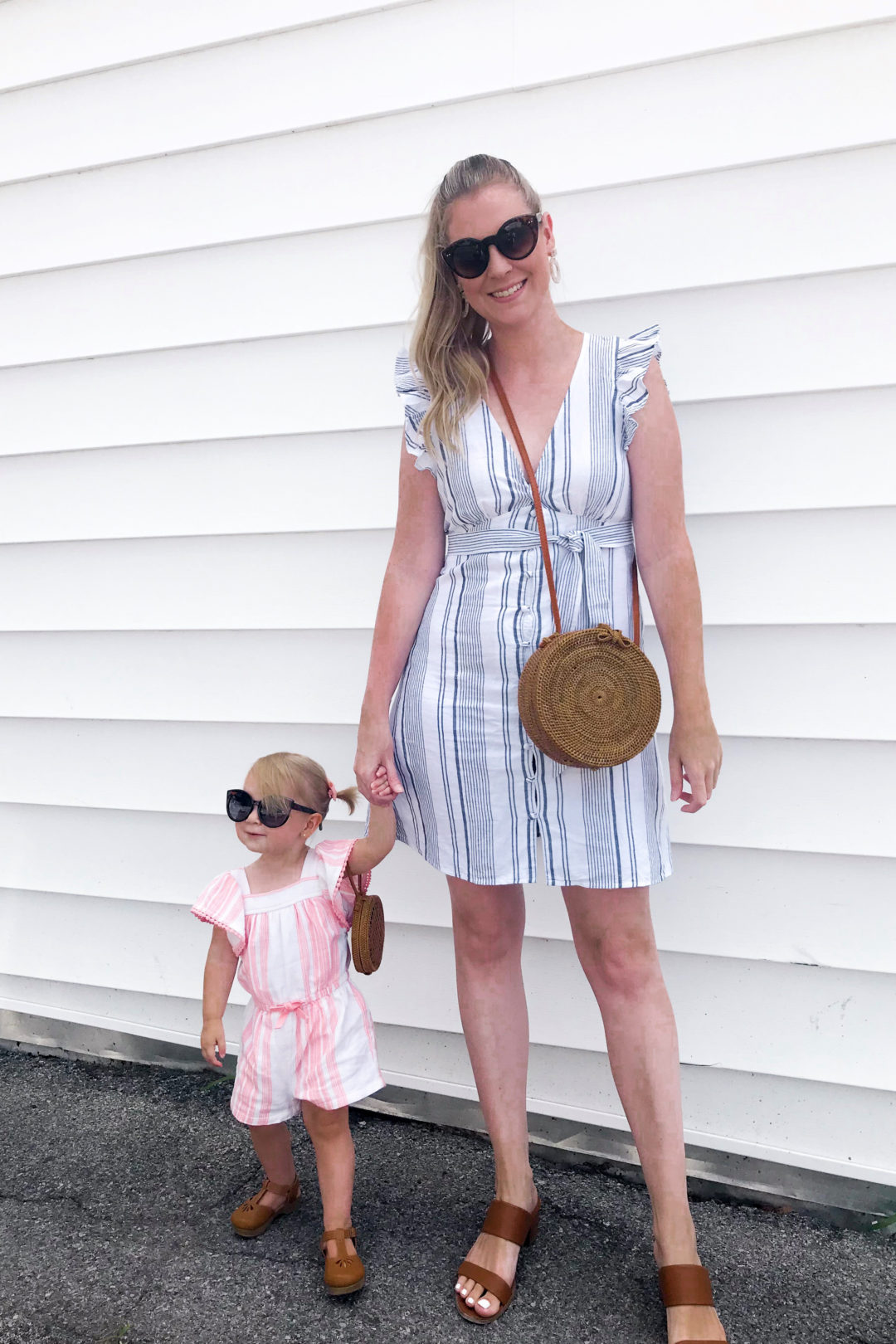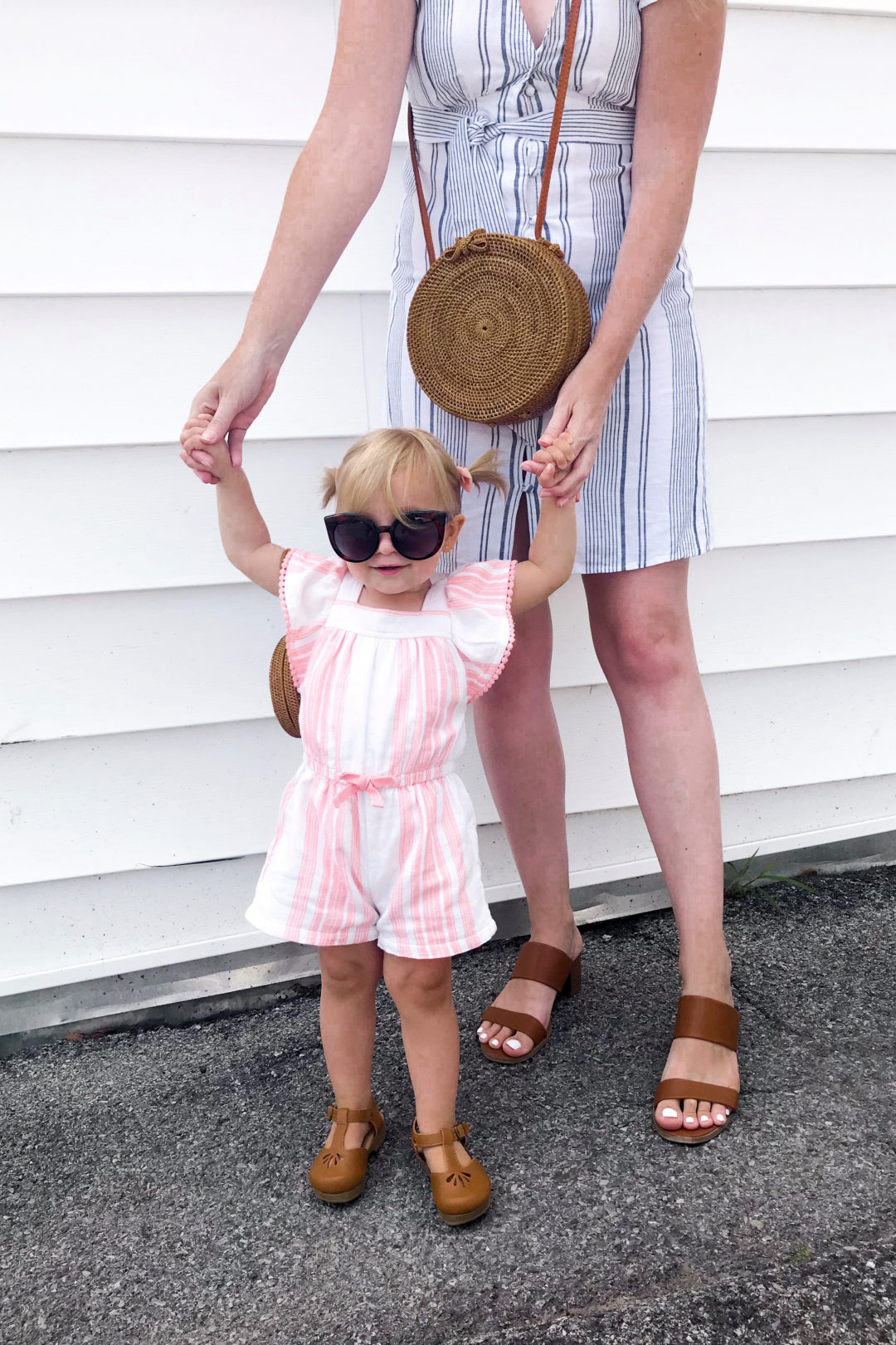 Today’s Daily Look for Everley featured a sweet little romper with salmon stripes, the cutest brown leather-look clogs and a wicker round coin purse, complete with cat eye sunglasses.